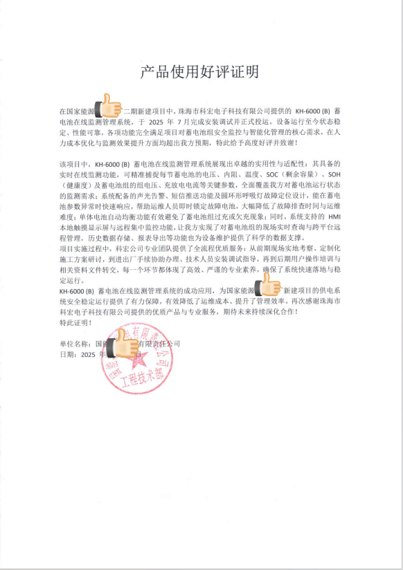 在國(guó)家能源某電廠二期新建項(xiàng)目中,珠海市科宏電子科技有限公司自主研發(fā)的KH-6000(B)蓄電池在線監(jiān)測(cè)管理系統(tǒng),于2025年7月成功投運(yùn)。設(shè)備運(yùn)行至今狀態(tài)穩(wěn)定、性能卓越,不僅全面滿足項(xiàng)目對(duì)蓄電池組安全監(jiān)控與智能化管理的核心需求,更在人力成本優(yōu)化與監(jiān)測(cè)效率提升上超出預(yù)期,贏得項(xiàng)目方高度贊譽(yù)。